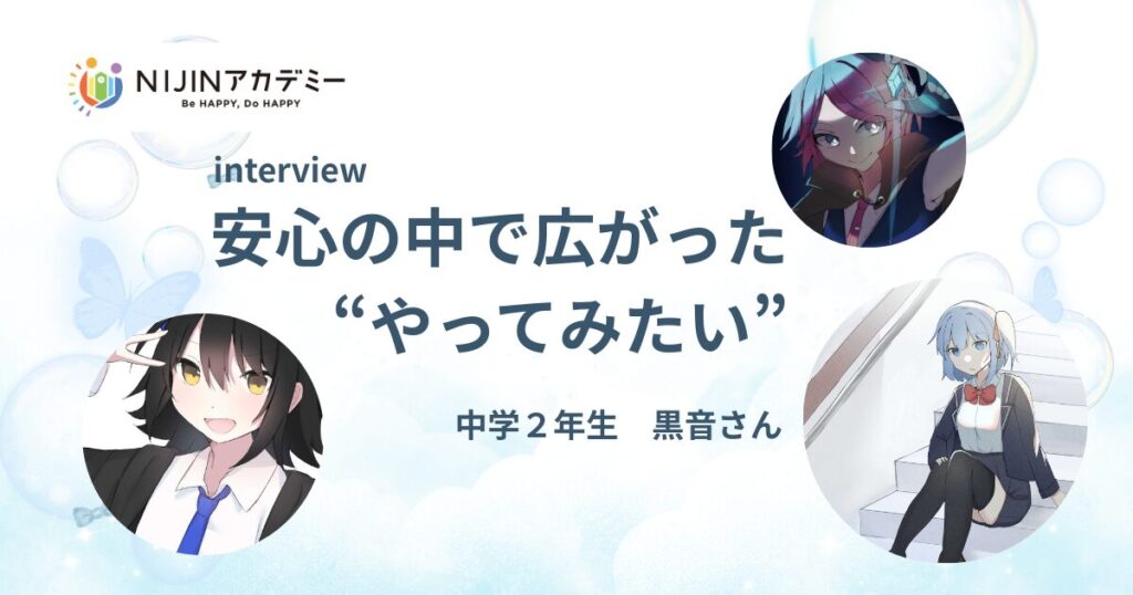 こんにちは、NIJINアカデミースタッフのぱるるです。今回お話を聞いたのは、中学2年生の黒音さん。2024年12月にNIJINアカデミー(以下、ニジアカ)に入学しました。 入学からまだ1年ほどですが、oVice社へのプレゼン、学園祭へのイラスト出展、立川ダイス... フリースクール