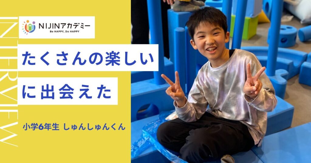 こんにちは。ボランティアスタッフのいっちーです。 今回は小学6年生 しゅんしゅんくんのインタビューをお届けします。 小学校に通いながらNIJINアカデミーに所属し、授業やイベントにも参加をしているというしゅんしゅんくん。 ニジアカでは今までにない... -