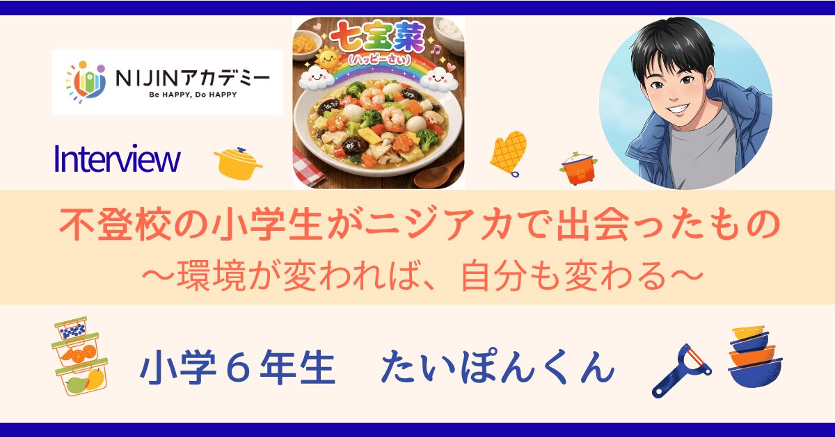 クラスのために働きかけ続けたことで、気づかないうちに心が疲れてしまったたいぽん君。そんなたいぽん君は、ニジアカで自分の力を発揮できる機会に出会いました。やってみたい気持ちが生まれ、今では料理企画や企業コラボという新しい挑戦に踏み出しています。たった一つの環境だけが全てではない——たいぽん君の歩みは、別の場所に身を置いてみることで、気持ちも、できることも、ぐんと広がっていくことを教えてくれます。これからもたいぽん君が自分の可能性を広げていく姿を、私たちはずっと応援しています。