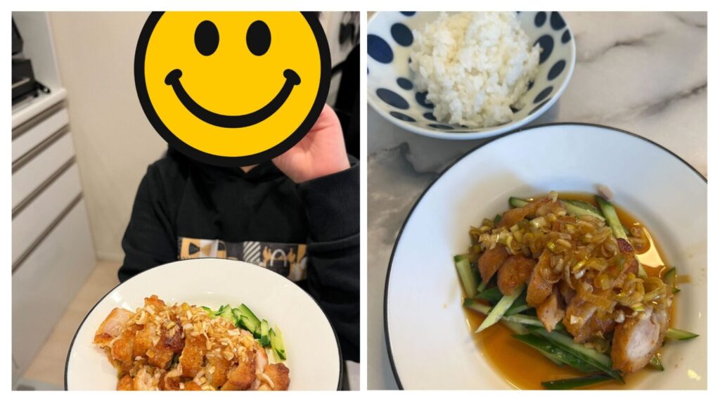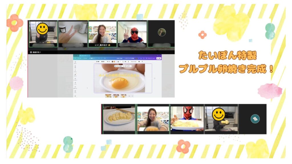 自宅でだし巻き卵や油淋鶏(ユーリンチー)を何度も練習し、調味料の分量を自分で調整しました。さらにCanvaで料理の工程表やスライドを作成。クラス会議でみんなと画面を共有しながら、オンラインで一緒に調理実習を行ったそうです。たいぽん君自身が企画し、準備から当日の進行まで担う——まさに「自分の企画」です。