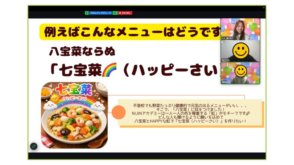 そう話すたいぽん君は、小学5年生の11月にニジアカへ入学しました。現在はクラス会議で自ら料理企画を立案し、Canvaで料理の工程表やスライドを作成。さらに、企業とのコラボレーション企画にも挑戦中です。
