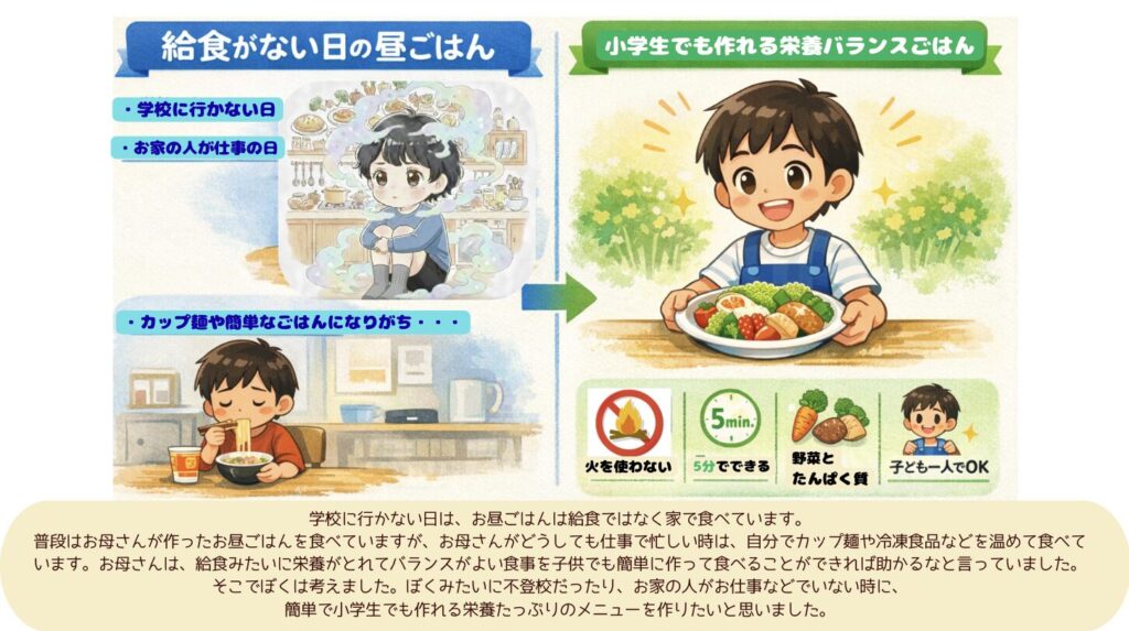 「仕事をしているとなかなか子供のお昼を毎日準備するのが結構できないこともあって。お昼ご飯も食べない子もいらっしゃるし。レトルトとか子どもでも簡単に作れるものを食べる子も多いと思うんですね」とお母さんは話してくれました。たいぽん君のご家族の体験から生まれた企画だからこそ、テーマに実感がこもっています。