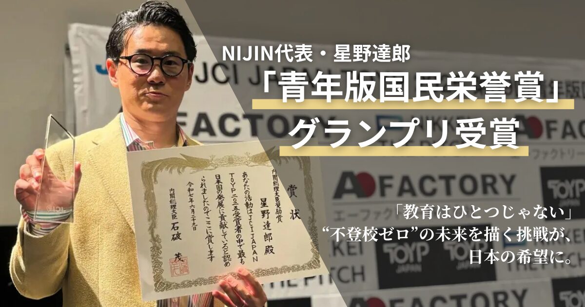 東京で開催された「JCI JAPAN TOYP 2025(The Outstanding Young Persons)」授賞式で、株式会社NIJIN代表・星野達郎が、グランプリにあたる「内閣総理大臣奨励賞」を受賞しました。