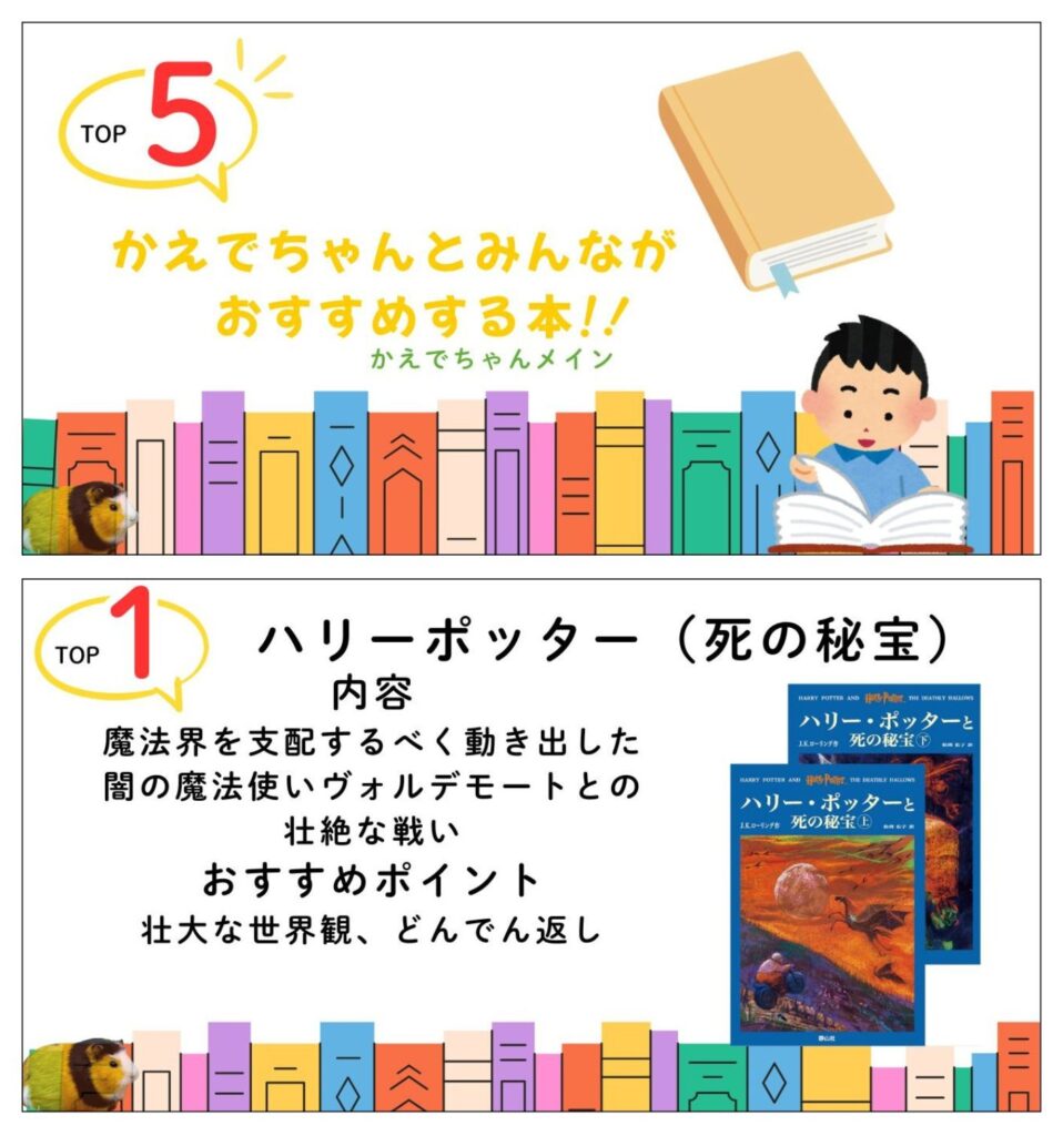 本の解説だけでなく、おすすめポイントもあって、みんなが「読んでみたい!」と思う発表をしてくれました。