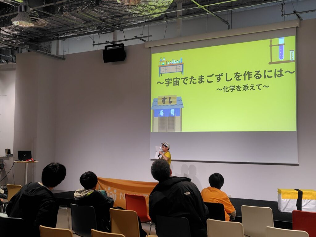 一見すると可愛らしいテーマですが、その中身は超本格的。無重力空間でシャリとネタをバラバラにしないためには?無重力だと醤油は醤油玉になってしまう!包丁は手を離した瞬間回転しながら飛んで行く?!これらを解決するには…子どもならではの自由な発想と論理的な考察で紐解きました。「宇宙でも大好きなものを食べたい」という純粋な欲求が、科学の扉を叩く。まさにイノベーションの原点ともいえる姿が、そこにはありました。