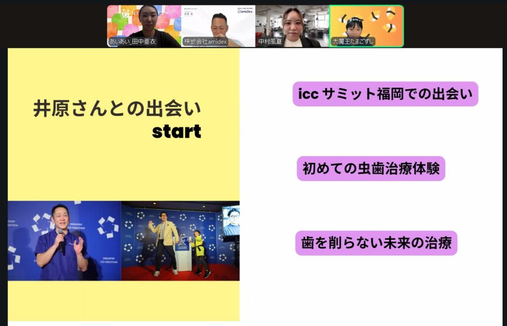 発端は、NIJINアカデミーの小学4年生・たまごずしが福岡で開催されたスタートアップイベント「ICCサミット」で株式会社amidex 代表・伊原さんのプレゼンを見たことでした。