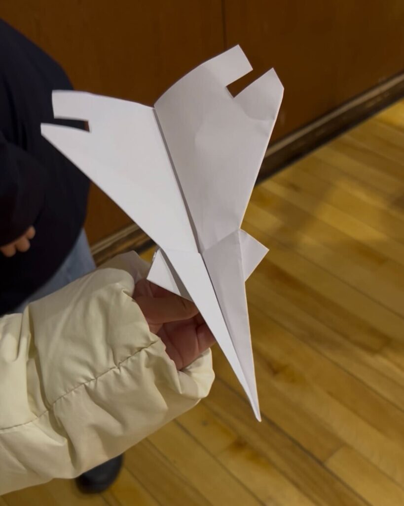 当日の朝、受付で配られた新聞紙や折り紙を使って作る子もいれば、家族と工夫を重ねた紙飛行機を持参する参加者もいました。