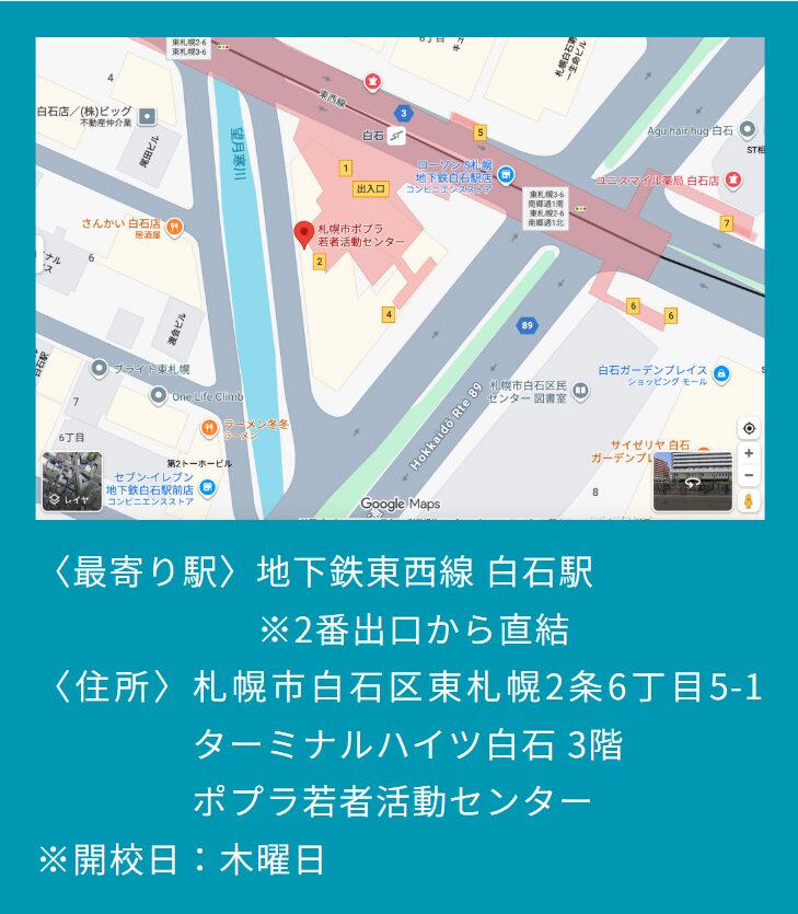 | 住所 | 札幌市白石区東札幌2条6丁目5-1 ターミナルハイツ白石3階・ポプラ若者活動センター |